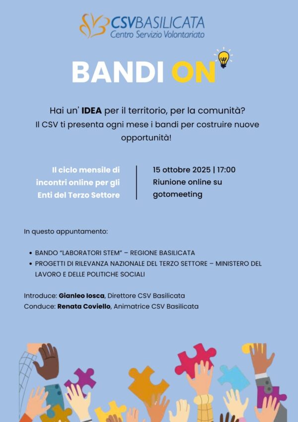 Ritorna l’appuntamento con “Bandi On” ciclo di incontri mensili online del CSV Basilicata dedicati alla presentazione di bandi regionali e nazionali. Il nuovo appuntamento online è per il 15 ottobre 2025, alle ore 17.00, su GoToMeeting.
