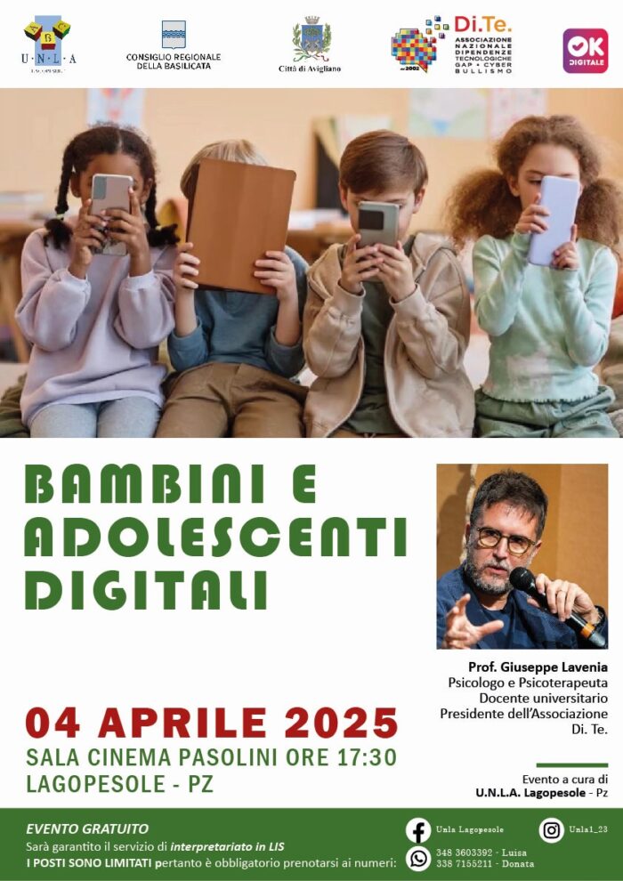 L’associazione Di.Te. (Associazione Nazionale Dipendenze Tecnologiche Gap e Cyber Bullismo) invitano il 4 aprile 2025, alle ore 17.30, a Lagopesole presso la Sala Cinema Pasolini, all’incontro “Bambini e adolescenti digitali”.