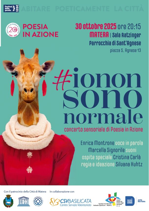 Il 30 ottobre 2025, alle ore 20.15, in piazza S. Agnese 13 a Matera, si terrà un concerto sensoriale di poesia in azione “#Io non sono normale”.