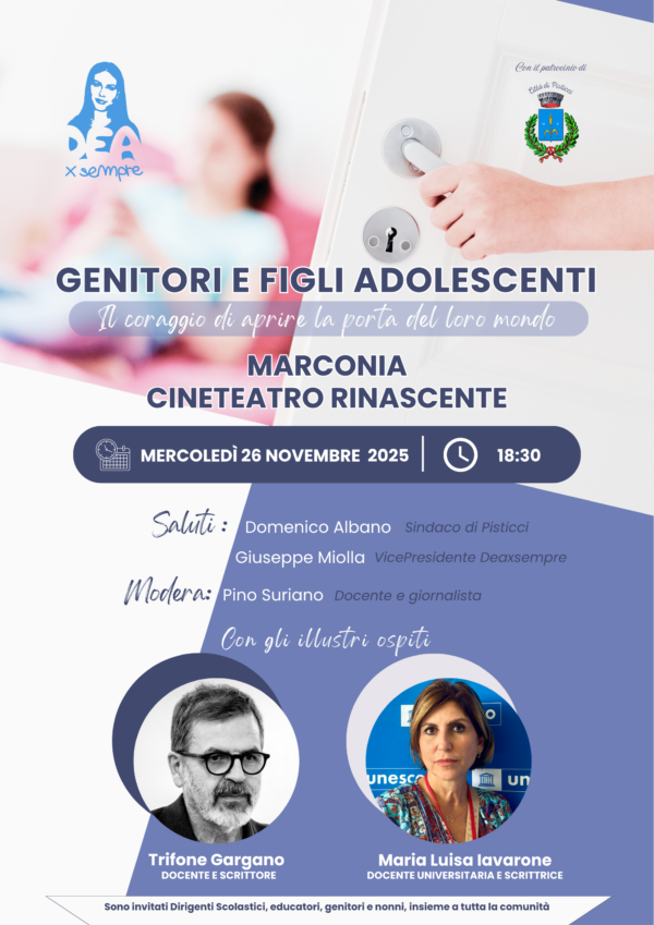 Il 26 novembre 2025, alle ore 18.30, presso il cineteatro Rinascente di Marconia, l’associazione Dea per sempre invita all’evento “Genitori e figli adolescenti. Il coraggio di aprire la loro porta”.