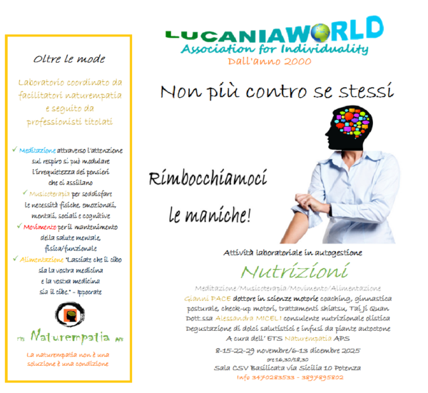 Ripartono, l’8 novembre, le attività laboratoriali in autogestione “Non più contro se stessi” dell’associazione Lucaniaworld.