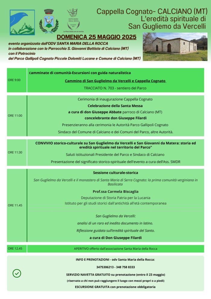 Il 25 maggio 2025, presso la Cappella Cognato a Calciano, l’associazione ODV Santa Maria della Rocca, in collaborazione con la Parrocchia San Giovanni Battista di Calciano e con il patrocinio del Parco Gallipoli Cognato e del Comune di Calciano, promuove l’iniziativa culturale e spirituale dedicata alla figura di San Guglielmo da Vercelli, monaco itinerante e fondatore del primo insediamento verginiano in Basilicata, “L’eredità spirituale di San Guglielmo da Vercelli e San Giovanni da Matera”.