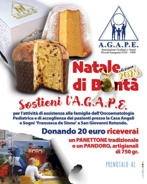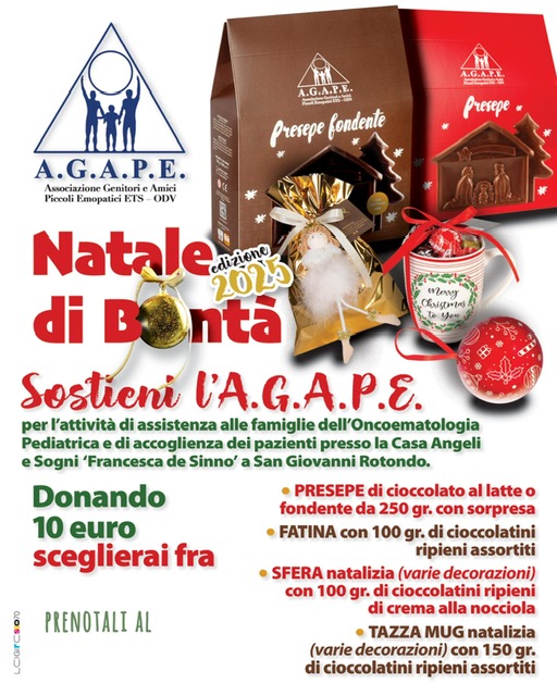 L’Associazione A.G.A.P.E. (Associazione Genitori e Amici Piccoli Emopatici) ETS promuovono il “Natale di bontà” edizione 2025.
