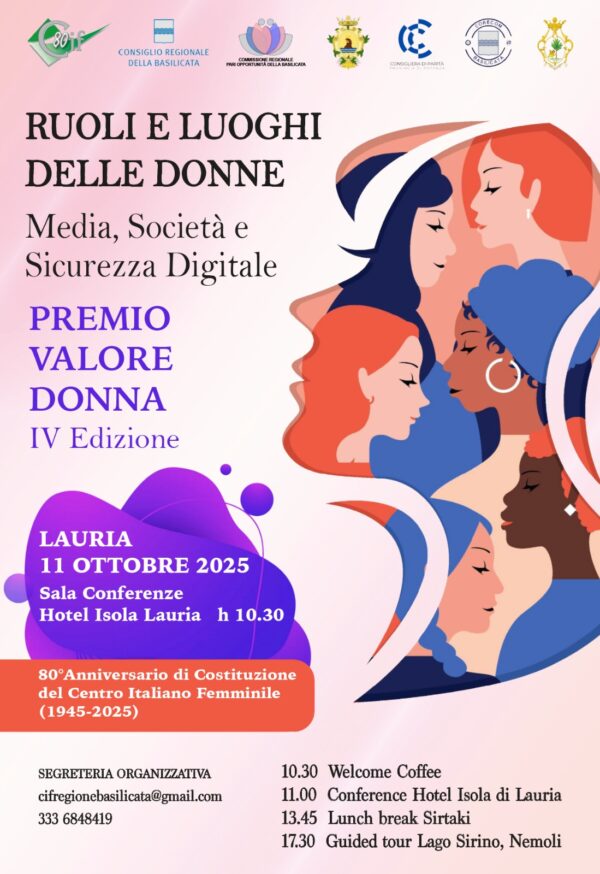 Il Centro Italiano Femminile (CIF) Regionale Basilicata invita l’11 ottobre 2025, alle ore 11.00, presso la Sala Conferenze Hotel Isola di Lauria, al Convegno “Media, Società e Sicurezza Digitale” e alla cerimonia di conferimento del Premio Valore Donna 2025 IV Edizione.