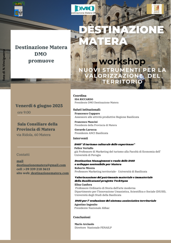 L’associazione Destinazione Matera DMO invita il 6 giugno 2025, alle ore 9.00, presso la sede della Provincia di Matera in via Ridola , 60 Matera, al workshop Dmo Destinazione Matera, nuovi strumenti per la promo valorizzazione del territorio. Il workshop è condiviso con la Provincia di Matera e Anci Basilicata, ed è rivolto ad amministratori locali, dipendenti pubblici, referenti associazioni turistiche/culturali e operatori della filiera turistica.