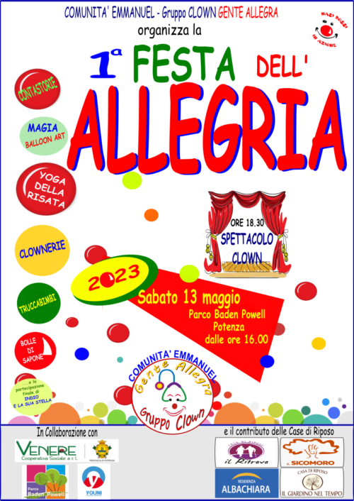 Il 13 maggio 2023, a partire dalle ore 16.00, presso il Parco Baden Powell di Potenza, si svolgerà la prima Festa Dell’Allegria per diffondere la cultura della clownterapia e del volontarioclown.