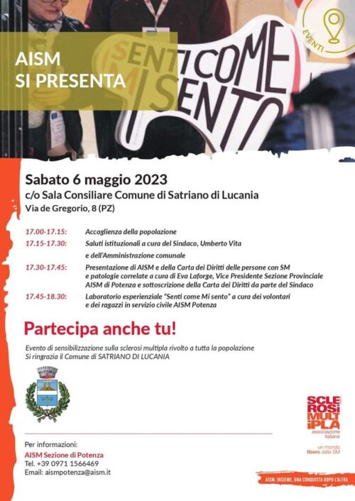 Sabato 6 maggio, a partire dalle ore 17.00, la Sezione provinciale Aism di Potenza sarà presente nel Comune di Satriano di Lucania per proporre la firma della Carta dei Diritti per le persone con Sclerosi multipla.