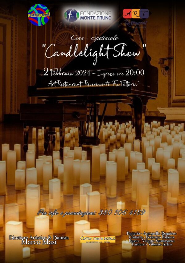 Il 2 febbraio 2024, a partire dalle ore 20.00, a Potenza, si svolgerà il Candlelight Show: cena spettacolo a lume di candela.L’evento è promosso da Sinergie Lucane e Art Restaurant Ricevimenti, in collaborazione con la Fondazione Monte Pruno.