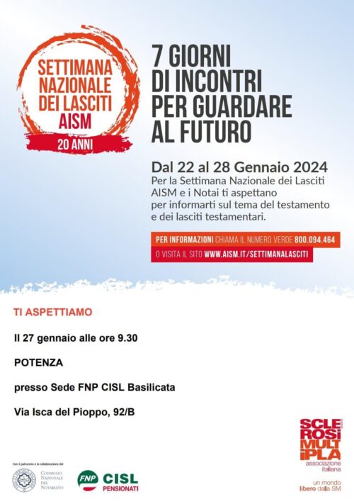 Il 27 gennaio 2024, alle ore 9.30, presso la sede FNP CISL Basilicata in via Isca del Pioppo 92/B a Potenza, la Sezione Provinciale AISM di Potenza invita, in occasione della Settimana Nazionale dei lasciti AISM, all’incontro di informazione sull’importanza del lascito solidale.Questa iniziativa rappresenta un importante tassello della campagna nazionale “Il Futuro sei Tu,” volta a sensibilizzare l’opinione pubblica sui lasciti solidali per sostenere le persone con sclerosi multipla, neuromielite ottica e patologie correlate.